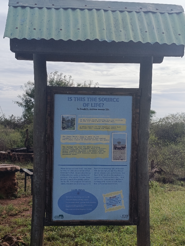 wooden signpost with a green corrugated metal roof in a grassy area. The signpost is located at coordinates -2.697, 38.165, which corresponds to a location in Mtito Andei, Kenya. The sign contains a blue background with a title that reads "Is this the source of life?". It also includes some text about the "Tzavo Faru" and various wildlife in the area, a small park rules section, and a small sign that reads "No entry: beware of hippos, crocodiles and dangerous wild animals." The signpost is situated in a grassy area with a few trees and bushes. The ground is dry and brown. There are two rustic tables made of logs with benches in front of the sign. There are no people visible in the image.