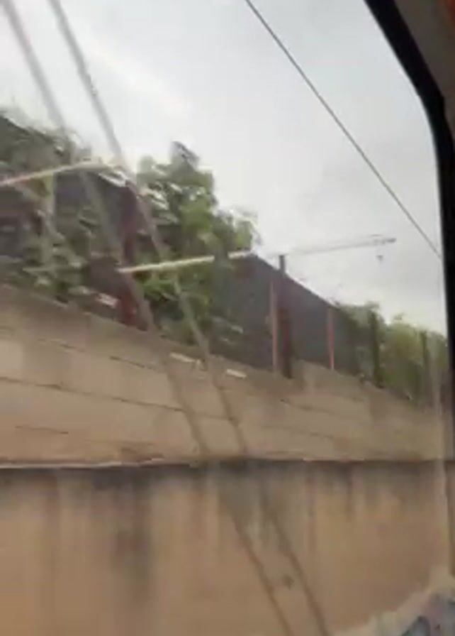 view from inside a moving train, looking out of a window. The scenery consists of a concrete wall, overgrowth of trees and bushes, grass, a road, and a cloudy sky. Graffiti is visible on the concrete wall. The train is moving forward.