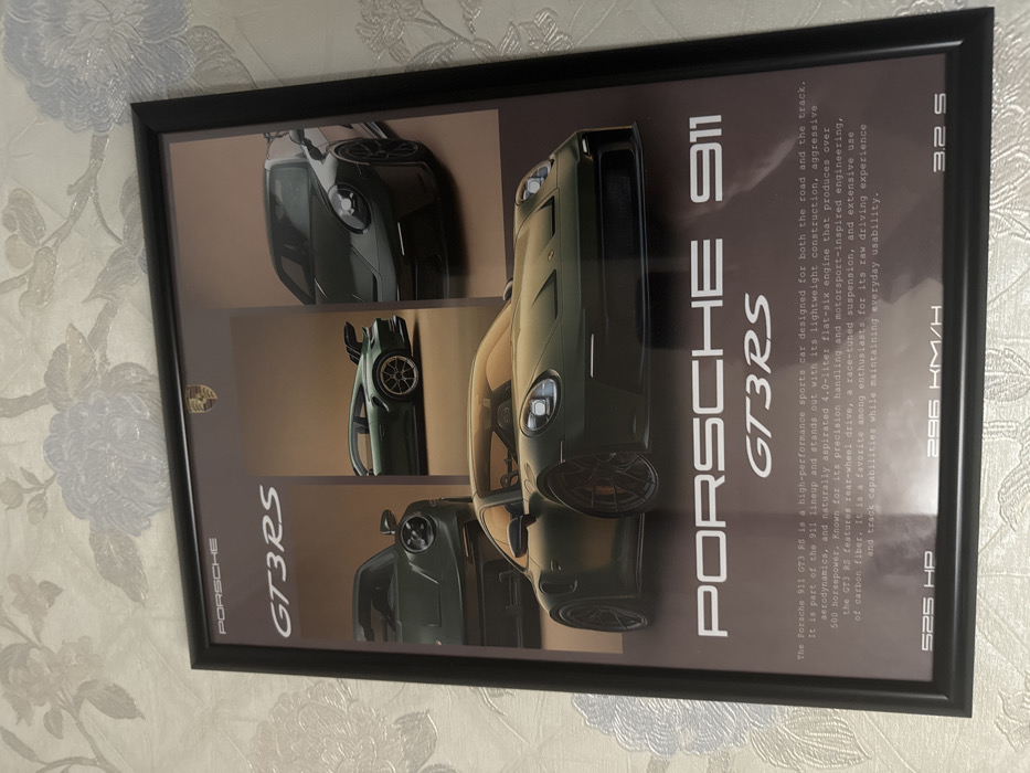- "A framed poster featuring a dark green Porsche 911 GT3 RS is centrally displayed on a wall in Krasnodar, Russia" by FM-EkDzD2, licensed under CC BY 4.0