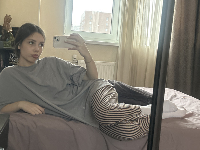 A young female, appearing to be in her late teens or early twenties, is positioned in a bedroom in Kudrovo, Russia. She is lying on her left side on a bed covered with a light brown duvet. Her upper body is supported by her left elbow, and her right arm is extended, holding a light-colored smartphone with a triple-lens camera towards herself. She is actively photographing her reflection in a tall, dark-framed mirror positioned to her right. The female has dark hair, pulled back, and is wearing an oversized grey t-shirt and striped pajama bottoms (black and light brown stripes), along with white socks. Her lips are slightly pursed, and her gaze is directed towards the phone/mirror. The bedroom setting includes a large window in the background, featuring sheer light-colored curtains and a heavier brown curtain partially drawn. Outside the window, parts of an urban residential building are visible. A white radiator is situated beneath the window. To the left of the female, behind her head, a dark shelf or bookshelf is visible, holding a reddish-brown figurine resembling a bear, other indistinct objects, and a book with "MAGIC" visible on its spine. The room's walls appear to be a light, neutral color. Natural light illuminates the scene primarily from the window.