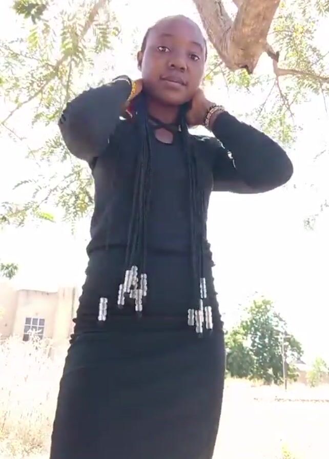 A young woman is seen in a short outdoor video clip. She is standing under a tree, dressed in a black, long-sleeved top and a black pencil skirt. She has braids with silver-colored beads woven into them. The sun shines brightly behind the tree, creating a somewhat high-key shot. In the background, there is a building, some grass, and another tree. The woman adjusts her braids, turns slightly to the side, and then smiles at the camera while making small dance-like movements with her arms.
