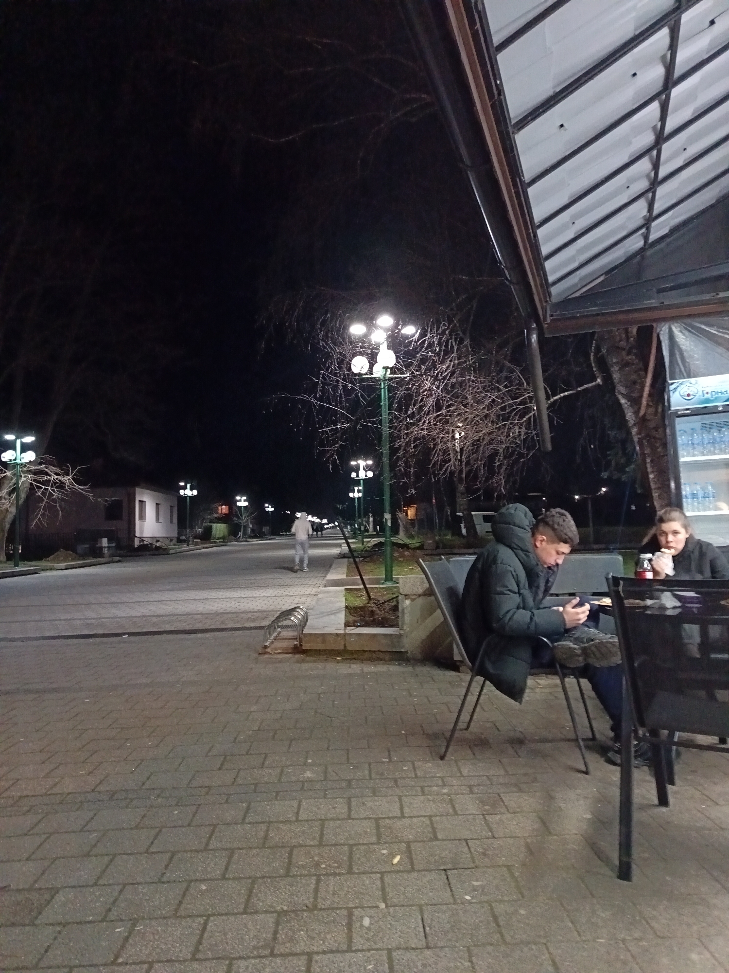 The image depicts a nighttime scene in a pedestrian area of Pravets, Bulgaria. In the immediate foreground on the right, two individuals are seated at a dark metal outdoor table beneath a white corrugated awning structure. The male, positioned on the left, wears a dark hooded puffer jacket and dark trousers; he is looking down at a smartphone held in both hands. The female, seated to his right, wears a dark top and is looking towards the left, holding a red container or cup near her mouth. A white commercial refrigerator/cooler with bottled beverages, featuring the brand "Горна," stands behind them. To the left of the seated individuals, a wide paved walkway or pedestrian street extends into the distance, illuminated by multiple streetlights with green poles and white spherical luminaires. Bare deciduous trees line both sides of this path. A silver-colored metal bicycle rack is visible on the edge of the paved area in the midground left. Further down the walkway, a lone individual in light-colored clothing is walking away from the camera. In the distant left midground, a small, light-colored building with windows is partially visible. The sky above is dark, indicating night, with additional distant lights and tree silhouettes against the horizon.