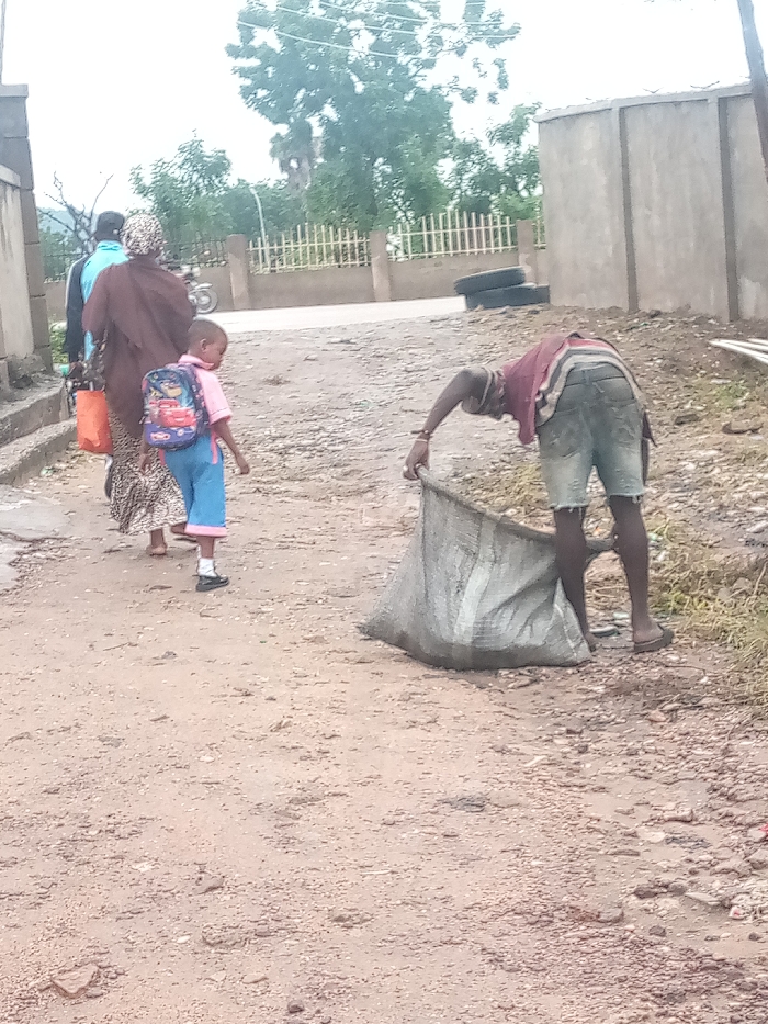 The image depicts an outdoor scene in the city of Lokoja, Nigeria, on an unpaved, reddish-brown dirt path. In the foreground, an adult individual is bent over, facing away from the camera, wearing a reddish top, faded denim shorts, and flip-flops, actively handling a large, grey woven sack on the ground. A white garment is visible tucked into the back of their shorts. To the left, a group of three individuals walks away from the camera. The foremost is a young child, estimated 4-7 years old, wearing a pink shirt, blue shorts, white socks, black shoes, and a multi-colored backpack featuring "Cars" characters. The child's head is turned to the right. Behind the child is an adult woman in a patterned dress and a brown top, carrying an orange bag. Behind her, partially obscured, is another adult in a light blue top. The background features a concrete wall, a white metal fence bordering a paved road section, several trees with green foliage, and two discarded tires stacked horizontally. A motorcycle is faintly visible in the mid-ground near the fence. The sky is bright and diffused.
