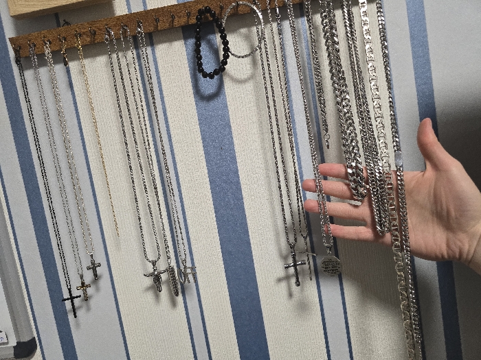 The scene depicts an interior setting within the city of Byala Cherkva, Bulgaria. A light-skinned human hand, positioned on the right side of the frame, is interacting with a collection of metal chains. The hand holds approximately seven distinct silver-toned, heavy-gauge metal chains. Mounted horizontally on a wall is a narrow wooden rack fitted with numerous small metal hooks. From these hooks, approximately 20 necklaces and chains of varying lengths, thicknesses, and styles are suspended vertically. The majority are silver-toned metal, with a few appearing darker or gold-toned. Pendants are attached to several necklaces, including at least three cross designs (one black, one plain silver, and one silver crucifix), one circular disc with partially legible text (appearing to include "GOD IS MY" and "MARTER"), and a letter-shaped pendant (possibly "JUF" or "YUF"). Also hanging on the rack are a dark beaded bracelet and a plain silver-toned bangle. The wall behind the jewelry is covered with wallpaper featuring alternating vertical stripes of light blue and off-white. A portion of a white object, possibly a frame or a whiteboard, is visible in the lower-left corner of the image. The lighting indicates an indoor environment.
