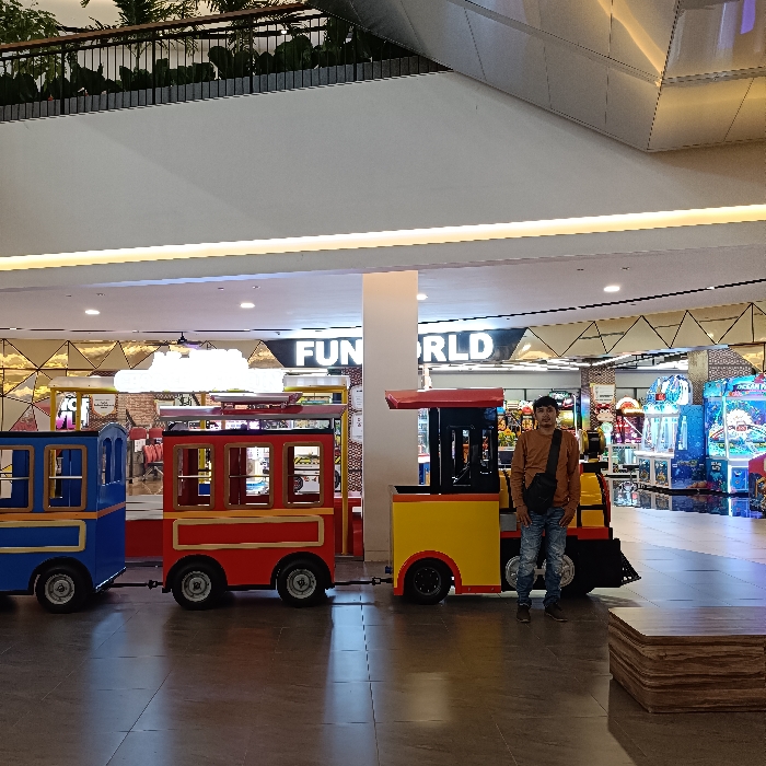 small, toy train in an indoor amusement park in Kecamatan Mijen, Indonesia, at coordinates -7.045 latitude and 110.324 longitude. The train is composed of three cars, the first two are red and blue, and the last car is yellow and black. A young man in a yellow shirt and black jeans stands beside the yellow car, facing the camera. The train is parked inside the amusement park, and several arcade game machines can be seen in the background. The scene is illuminated by artificial lighting.