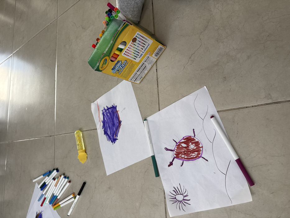 The image displays an indoor scene on a light-colored tiled floor in Aguascalientes City, Mexico. Several art supplies and finished drawings are scattered across the floor. Three pieces of white paper are visible: one in the lower-left corner depicts a red and purple insect-like creature with a purple sun and black ground lines; another in the upper-right features a purple abstract drawing over faint orange lines; and a third, partially visible sheet in the upper-left, shows blue markings. A collection of assorted colored felt-tip markers lies dispersed on the floor, alongside a yellow, transparent plastic object, possibly a glitter container. A partially crushed "Crayola Super Tips 100 Colors" cardboard box stands upright on the right, filled with numerous markers. A lower leg, clad in a light grey sock, is partially visible on the far right of the frame.