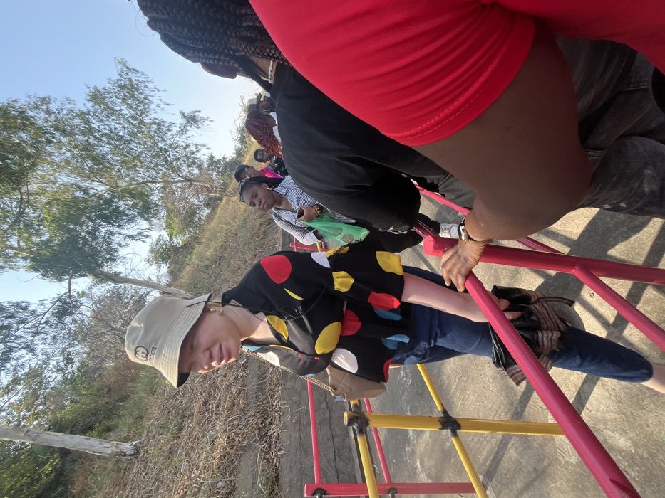 The image depicts an outdoor scene in Kunkwaba, Nigeria, under bright daylight. A group of individuals is gathered on a paved pathway, bordered by a multi-colored barrier featuring red horizontal rails and vertical yellow and red posts. In the left foreground, a fair-skinned individual, possibly exhibiting albinism, walks towards the right. They wear a light tan bucket hat with a dark "GUCCI" logo, a black short-sleeved button-up blouse adorned with large red, yellow, white, and blue polka dots, and dark blue jeans. A light brown quilted shoulder bag with a gold chain strap hangs on their left side, and they hold a dark, striped object in their left hand near the railing. Gold hoop earrings are visible on their ears. To the immediate right, partially obstructing the view, is the shoulder and arm of a dark-skinned person wearing a red short-sleeved shirt. Their right hand rests on the red railing. Behind them, another dark-skinned individual wears a black t-shirt, grey jeans, and white sneakers, also near the railing. Further back, a dark-skinned woman in a light-colored striped shirt and dark pants stands holding a green mesh bag and a smartphone. Several other dark-skinned individuals are visible in the background, standing in what appears to be a queue or group. The background features an upward sloping embankment covered with dry, light-colored vegetation and several trees with light bark and sparse green leaves. The sky is clear and bright blue. Strong sunlight casts distinct shadows on the ground.