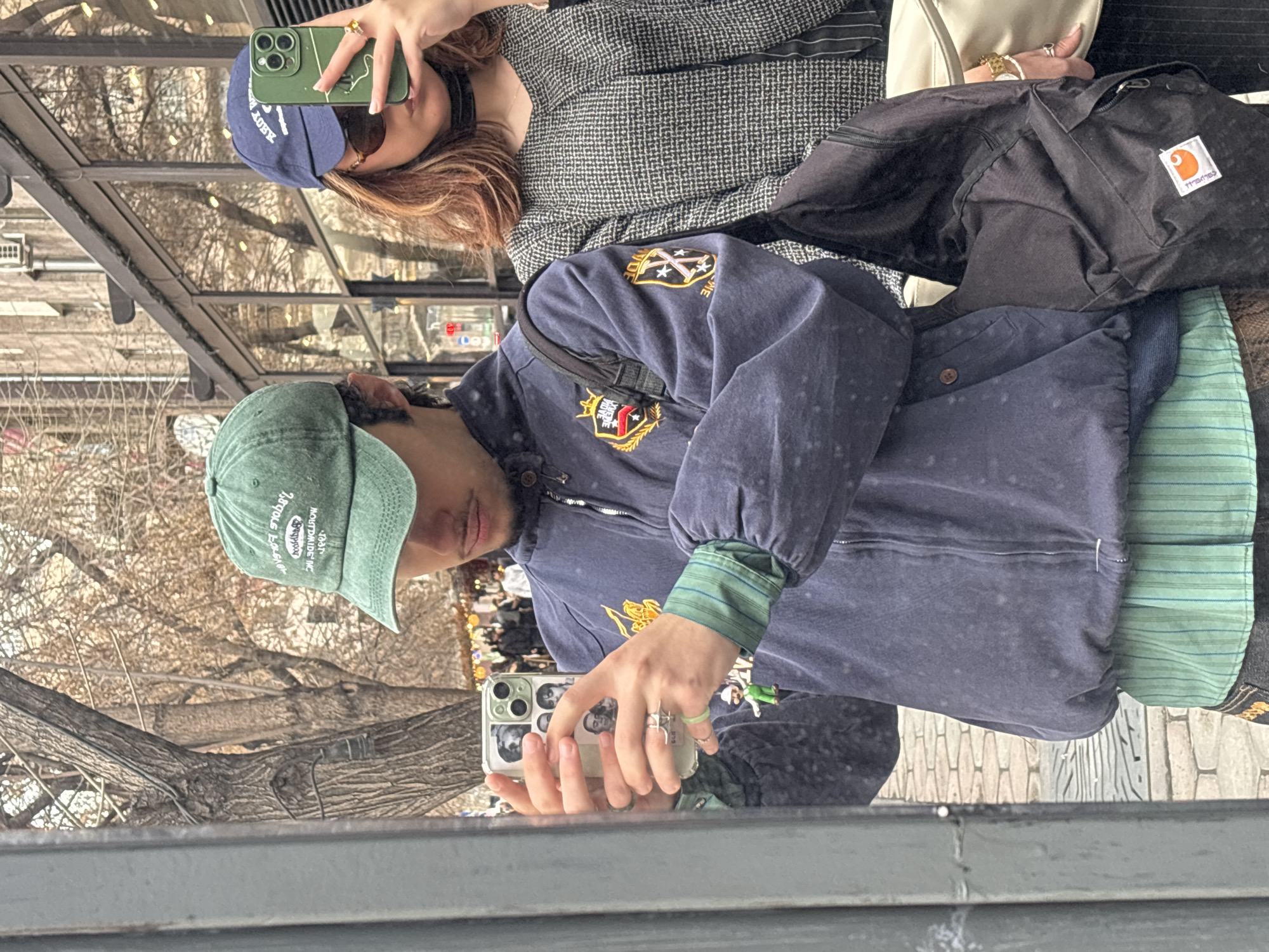 Two people are reflected in a window or mirror. One person wears a blue baseball cap and sunglasses, holding a phone with a green case. The other person wears a green baseball cap and a blue jacket, also holding a phone. The reflection shows a city street scene with trees and buildings. The label on the black bag reads "Carhartt." The location is Yerevan, Armenia.