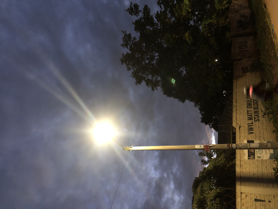 The image depicts an outdoor urban scene at dusk or early night in Nairobi, Kenya, under an overcast, dark blue-grey sky. A bright street lamp on a tall, light-colored pole stands in the left-center, emitting a strong white light with a starburst effect. A light-colored concrete or plastered wall, topped with barbed wire, spans horizontally across the midground. Painted on this wall are the words "VINYL MATT EMULSION STAIN BLOCK" and partially visible "IF YOU LIKE IT...", alongside a black exclamation mark to the left. The lamp pole is adorned with various posters and stickers, including one with "XTR". Dense, dark green trees are visible behind and above the wall, particularly on the right. A blurred figure, consistent with a person on a bicycle, is captured in motion, moving left to right along the base of the wall in the lower right quadrant, with a faint red light visible on their person. The ground adjacent to the wall on the right is dark and indistinct.
