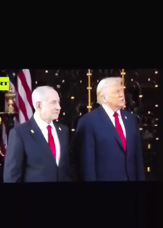 Two men stand side-by-side, both wearing dark suits and red ties. The man on the left has white hair and is looking to his right. The man on the right has blond hair and is speaking. Behind them is an American flag and a decorative backdrop with lighting. A logo that reads "RT" is visible in the top left corner of the screen.