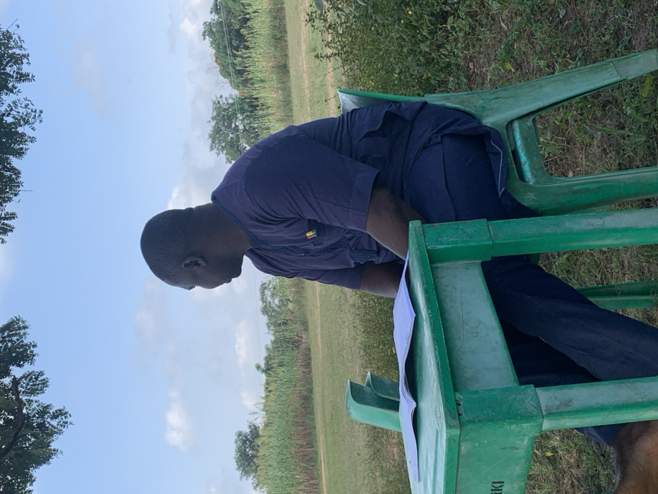 An adult Black male is seated outdoors on a light green plastic chair at a matching light green plastic table, in a grassy area within Akwanga, Nigeria