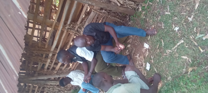 Four men are gambling in front of a shed. The men are crouched around playing cards on the ground, with several cards discarded around them. The shed has a corrugated metal roof and a wooden structure. The ground is covered in grass and leaves. The man at the top is wearing a black shirt and blue jeans. The man next to him is wearing a white shirt with a black stripe on the sleeve.