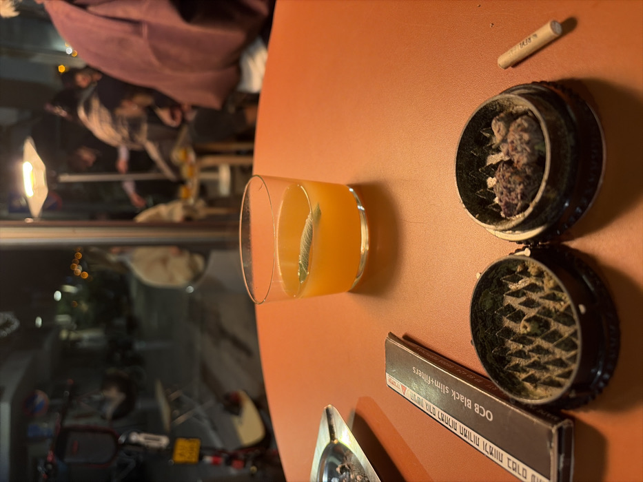 A tabletop scene includes an orange drink in a glass, a black grinder with marijuana buds in the top half and ground weed in the bottom, a pack of OCB Black slim filters, a cigarette filter, and a small portion of an ashtray. The table is a terracotta color and there is a reflection in the glass of a room with people, a lamp, and other items.