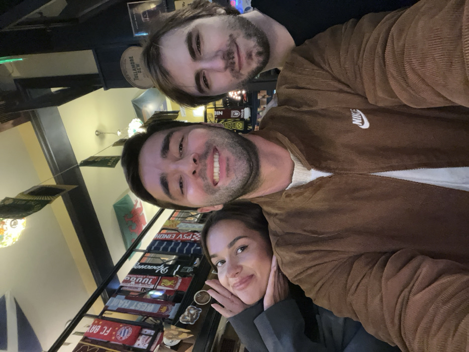 The image is a selfie taken indoors, depicting three individuals in what appears to be an Irish-themed pub or sports bar