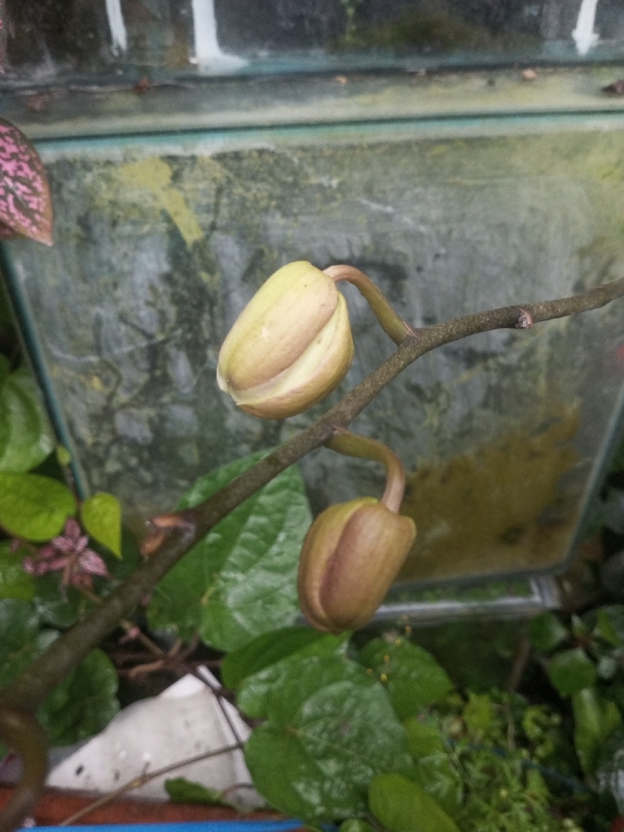 The scene, located in Ura-Dozhi, Bhutan, presents a close-up of a plant branch bearing two developing flower buds. The upper bud is elongated and yellowish-tan, displaying a vertical fissure indicative of partial opening. The lower bud, positioned beneath it on the same woody, dark brown branch, is a darker reddish-brown and appears fully closed. Both buds are attached via distinct, curved pedicels. Surrounding the branch are various green leaves, some with pinkish-red speckled patterns, indicative of dense plant growth. In the background, a rectangular, translucent container, possibly glass or plastic, exhibits a heavily stained or algae-covered greenish-grey surface. Fragments of white material are visible on the ground in the lower-left, with a blue line marking the bottom edge of the frame. No human subjects or animals are present.