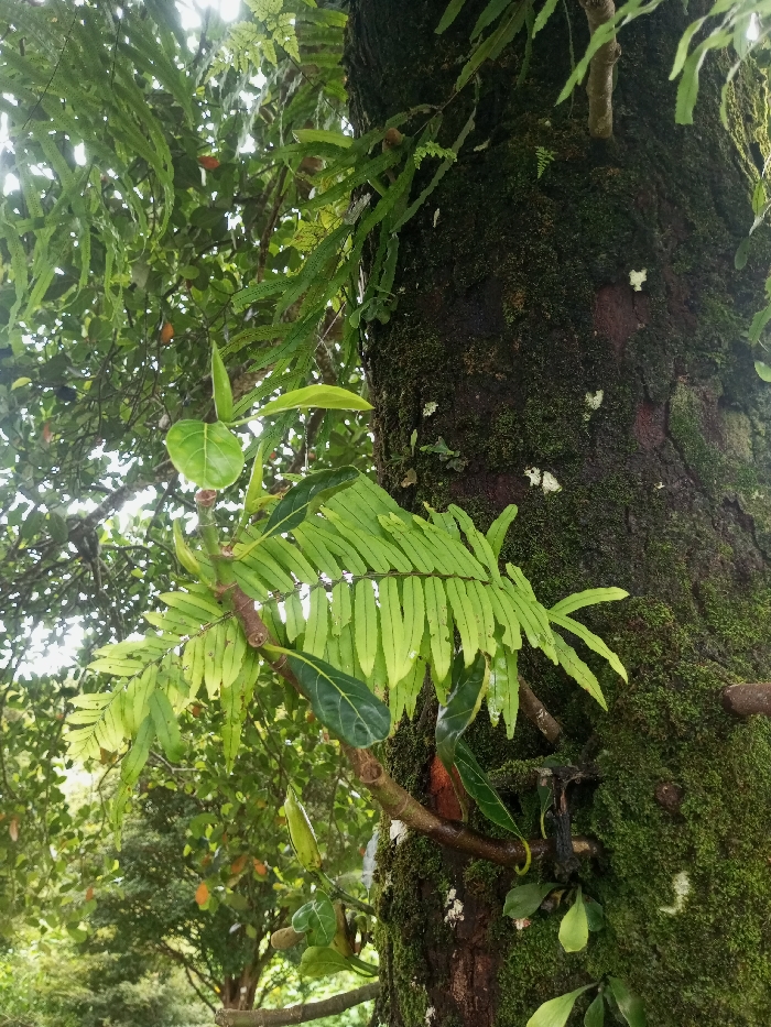 A tree trunk, heavily covered in green moss, stands in the foreground. Various ferns are attached to the trunk and surrounding branches. Fresh green leaves are growing on a branch extending from the tree, contrasting with the mossy texture. Other trees and foliage are visible in the blurred background.