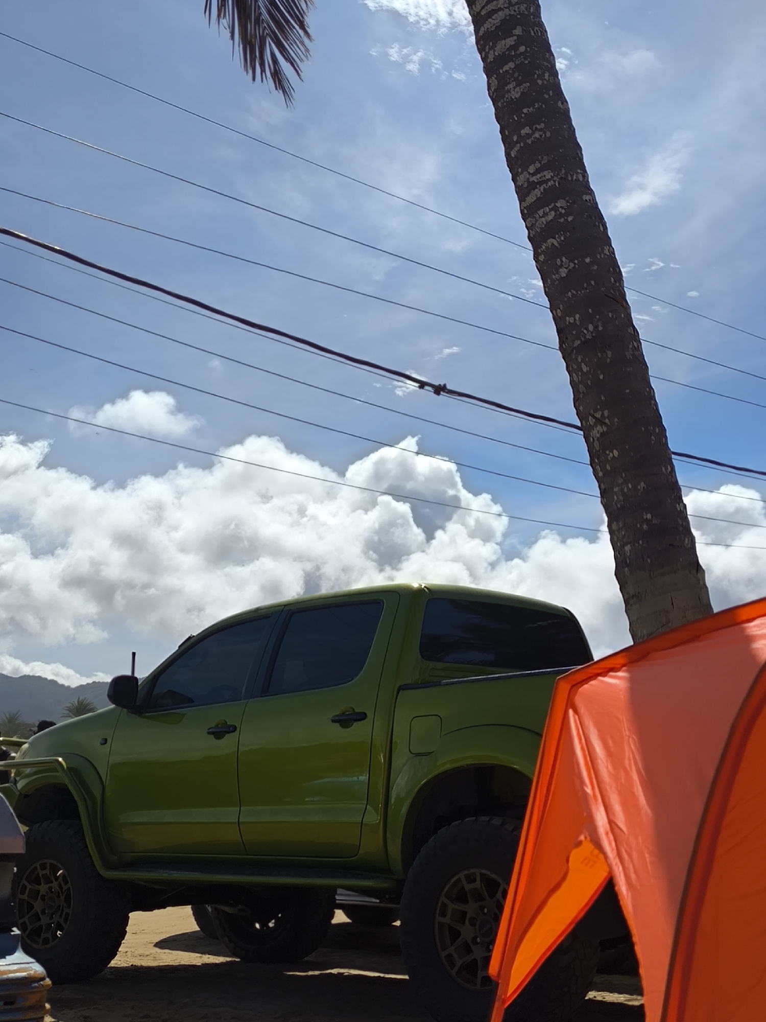 A green, four-door pickup truck is parked next to a palm tree and an orange tent, presumably on the beach in El Espinal, Venezuela, based on the sandy ground and the presence of a palm tree. Power lines stretch across the upper portion of the frame against a cloudy sky.