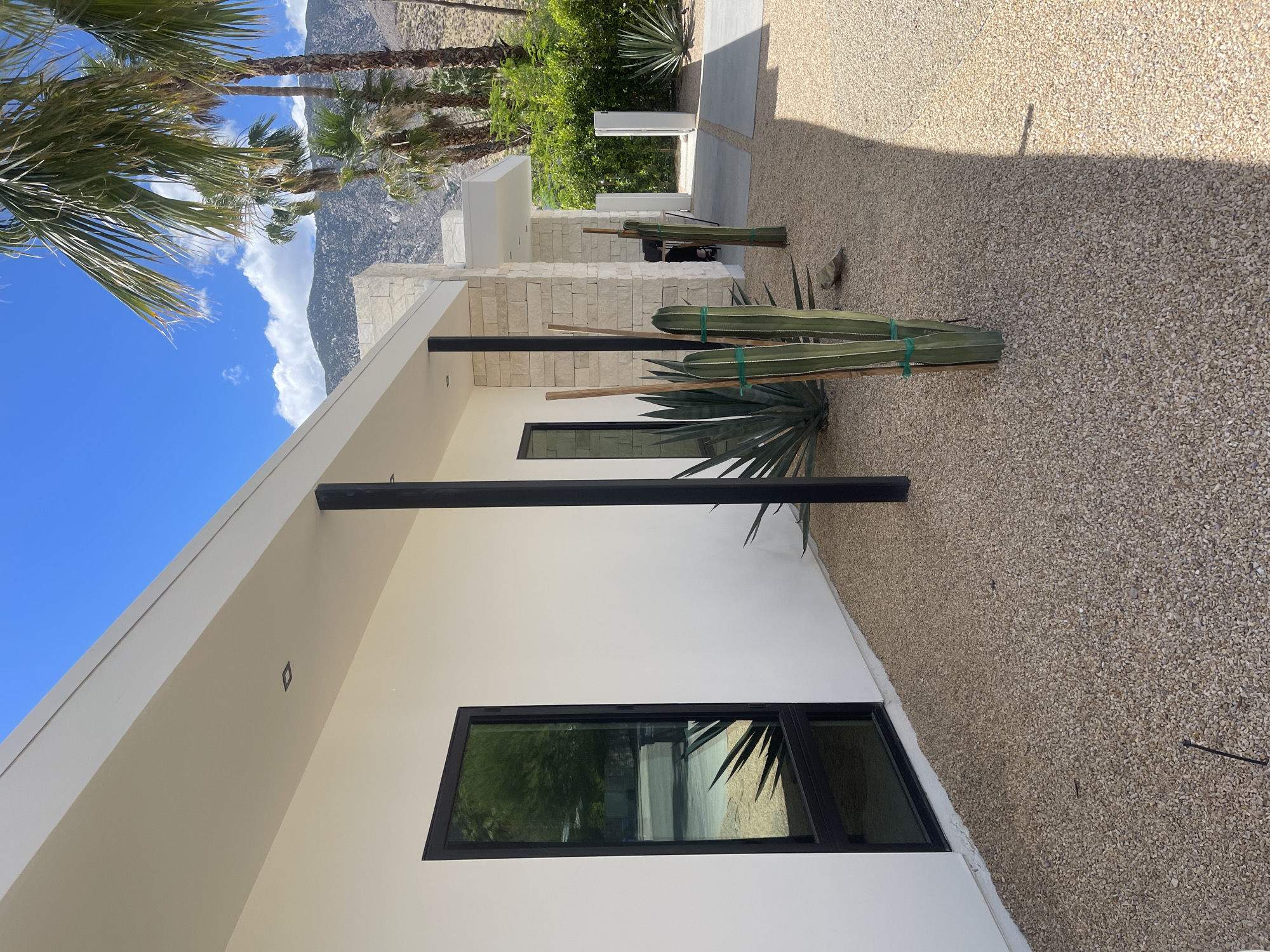 This eye-level shot, rotated for perspective, presents an outdoor scene in what appears to be Palm Springs, United States. The architecture exhibits modern design, with a white, flat-roofed building featuring black-framed, horizontally-oriented windows. The exterior is decorated with natural stone accents, adding texture to the facade. The foreground features a gravel ground cover, indicating a desert landscape. Two saguaro cactus cuttings, wrapped and supported with wooden dowels, lie horizontally on the gravel. An agave plant grows nearby. In the background, palm trees rise against a partly cloudy, blue sky, with mountains visible in the distance. The presence of the saguaro cactus and agave, along with the palm trees and desert landscaping, strongly suggests the location is in a desert climate. The architecture is consistent with the style found in Palm Springs.