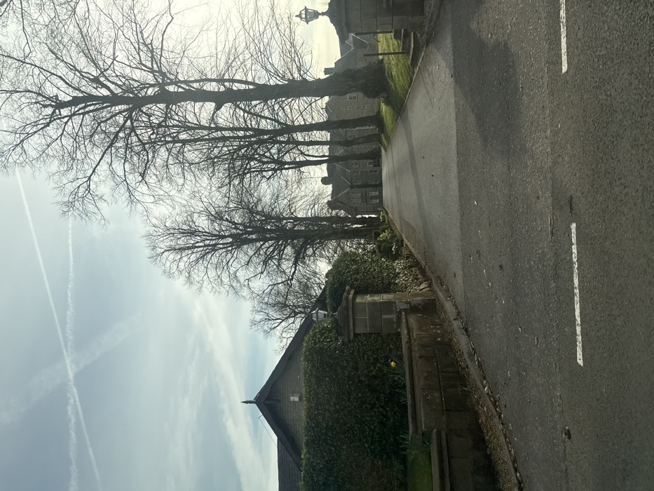 The image displays an asphalt driveway ascending towards a large stone manor house under a partially cloudy sky with two intersecting contrails. The scene is identified as the private driveway of Holcombe Manor in Holcombe Village, Ramsbottom, Bury, United Kingdom. In the foreground, the asphalt driveway features a faded white dashed line. To the left, a stone retaining wall supports a dense, dark green hedge. A single yellow daffodil is visible blooming at the base of this hedge. A stone pillar, approximately chest-height, topped with a gas-style lantern lamp, marks the left side of the driveway entrance. The driveway continues uphill, flanked on the left by the dense hedge and on the right by a grassy verge. A prominent row of tall, bare deciduous trees lines the right side of the driveway, casting elongated shadows across the asphalt. A matching stone pillar with a lantern stands on the right side of the entrance, mirroring the left. In the background, at the top of the incline, stands Holcombe Manor, a substantial, multi-story building constructed of light-colored stone. Numerous windows are visible across its facade. The trees in the midground and background are bare, suggesting late winter or early spring. The sky overhead is a pale blue with scattered white clouds. No individuals, animals, or vehicles are present in the scene.