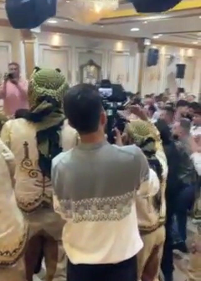 large, brightly lit hall filled with people celebrating. Several men dressed in traditional clothing with headscarves and embroidered vests are dancing in the center of the crowd. One man in camouflage clothing holds a microphone and appears to be leading the celebration. Many people in the crowd are holding up phones to record the event. A large chandelier hangs from the ceiling. Loudspeakers are visible, positioned to project sound across the room.