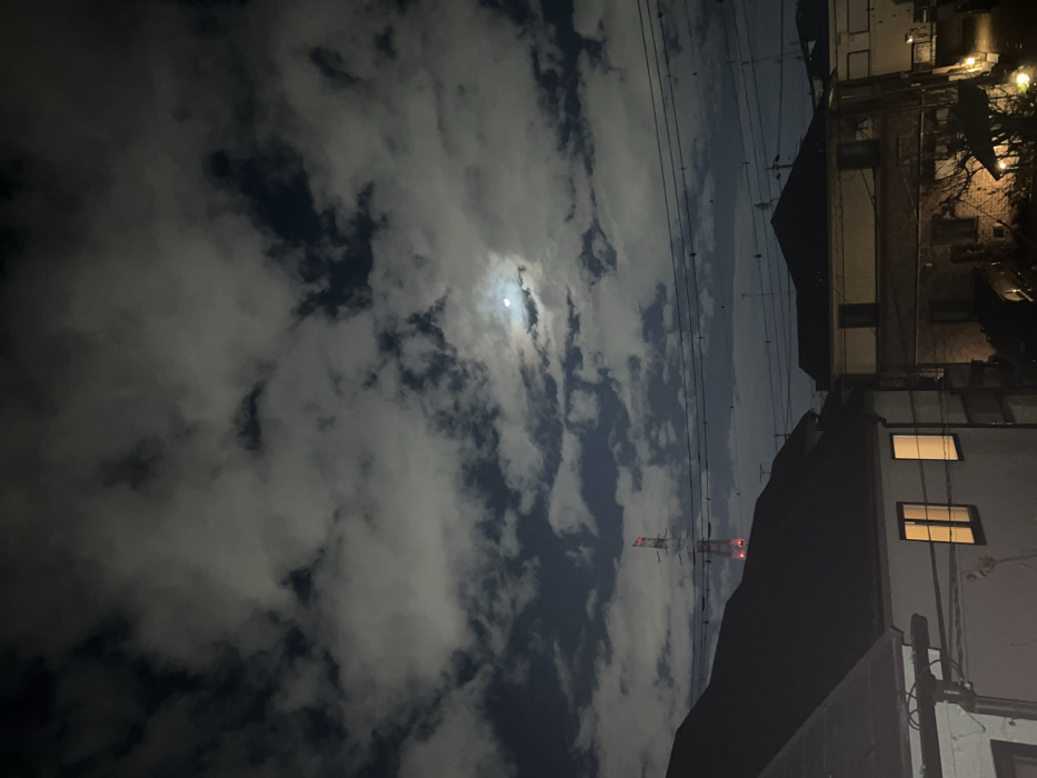The image depicts a nighttime scene in Kokubunji, Japan, viewed from an elevated perspective over residential rooftops. The sky is dark blue, predominantly covered by dense, illuminated clouds, with a bright, partially obscured moon visible through an opening in the upper right. In the mid-ground, the dark silhouettes of multiple residential building roofs are visible. On the left, a building shows two windows emitting a warm yellow light. Numerous utility lines, including power and communication cables, traverse horizontally across the mid-to-upper portion of the frame. In the distance, behind the rooftops and to the left of the moon, a tall electrical transmission tower or similar structure is visible, marked by several illuminated red warning lights. To the right, another building's facade is dimly lit, revealing some bare tree branches at its base, illuminated by unseen external lighting. No people, discernible actions, or interactions are present.