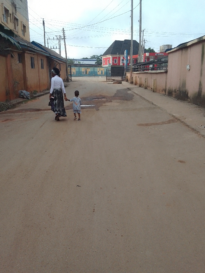 A woman wearing a white top and patterned skirt holds the hand of a young child in a blue patterned shirt, walking down a street. The road is paved and shows signs of wear. Buildings line both sides of the street, and utility poles stretch across the sky. A red building with a dark roof is visible in the background. The lighting suggests it is daytime, with an overcast sky.