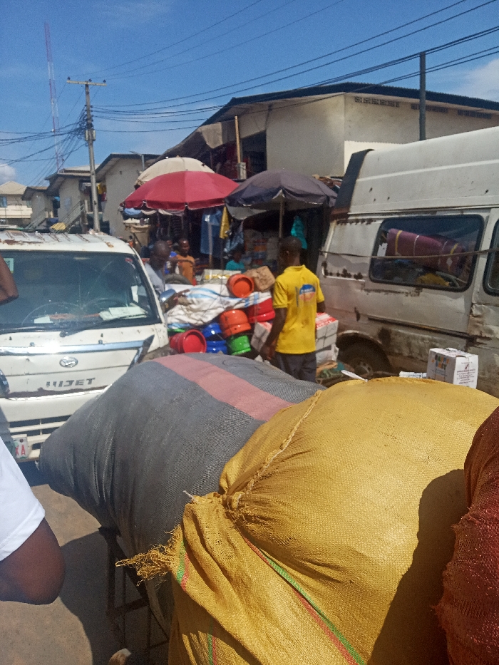 - "The image depicts a bustling outdoor market scene in Nkwelle, Nigeria, under a clear blue sky" by FM-Cz4JY2, licensed under CC BY 4.0