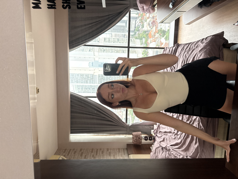 A fair-skinned woman with long, reddish-brown hair, wearing a light beige sleeveless top, a black mini-skirt with a front slit, a cross pendant necklace, and earrings, is depicted taking a mirror selfie