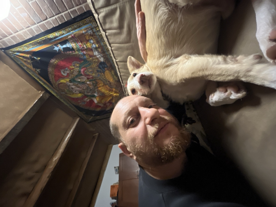 A man with a beard takes a selfie while lying on a couch. A light brown dog lies on top of him, its paws and legs outstretched. An ornate tapestry hangs on the wall behind the couch, featuring colorful figures and designs. The man wears a black shirt. The camera angle is tilted, capturing a view of the room's wooden paneling and furniture in the background.