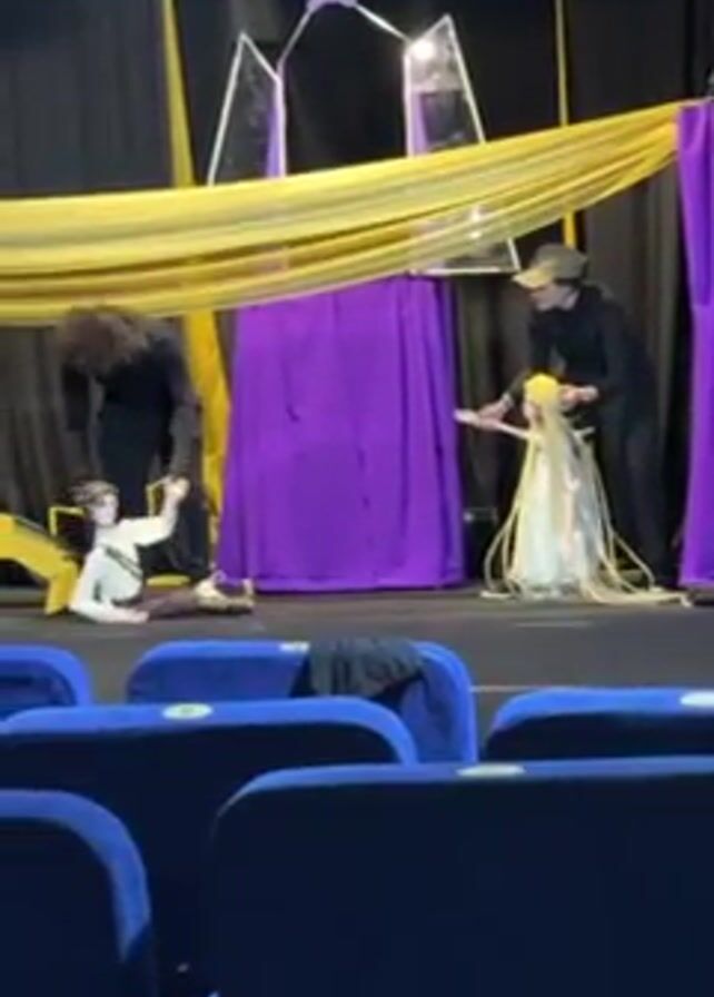 two people on a stage performing a puppet show. Both performers are dressed in black. The stage has a backdrop of black curtains, with a yellow drape across the top and a purple drape in the center. There are also three mirrored shapes arranged above the purple drape. On the stage, there are two puppets, one of a boy and one of a girl with long blond hair. The male performer is manipulating the boy puppet, while the other person is handling the girl puppet. The video is shot from the audience, showing rows of empty blue seats.