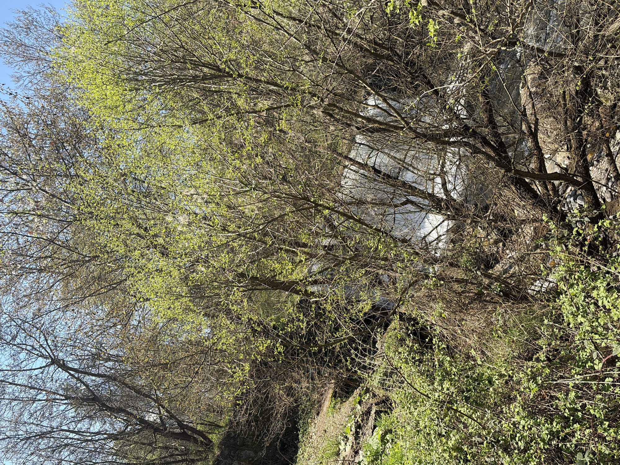 The image depicts a natural scene, likely a riverbank or ravine in Parvenets, Bulgaria. A water feature, possibly a stream or small waterfall, is visible through the branches of trees. The trees are in early spring foliage, with some bearing nascent green leaves. The terrain is vegetated with shrubs and grass. No people are present.