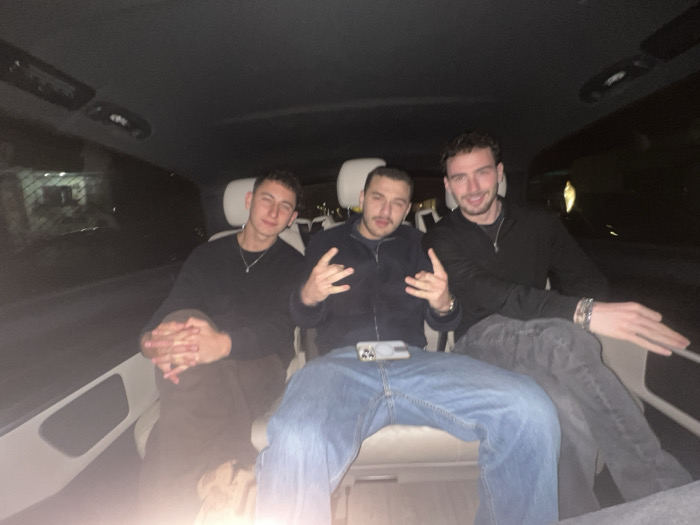 Three young men are seated inside a vehicle, likely a van or SUV, at night. The man in the center makes hand gestures while an iPhone sits on his lap. The man to his left has clasped his hands. The man on the right extends his arm to the side. All three wear dark tops and necklaces, and jeans. Outside is visible through the window. The vehicle interior is dark with white seats.