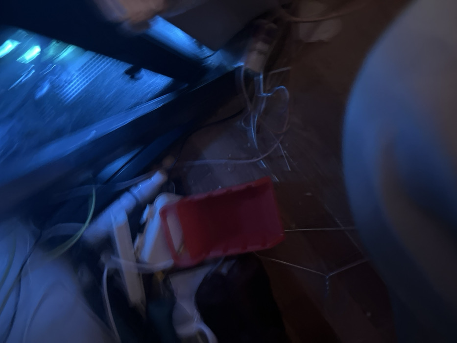 close-up of a red object, possibly a small toy, lying on a brown surface. It is partially obscured by a blue and black object in the background. The blue object appears to be made of plastic or metal. It is unclear what the red object is or its purpose. The blue object appears to be a screen, likely a computer monitor or television, with a blue light shining through the screen. The environment is dimly lit, with only the blue light from the screen illuminating the scene. The location is in Vũng Tàu, Vietnam, based on the provided coordinates.