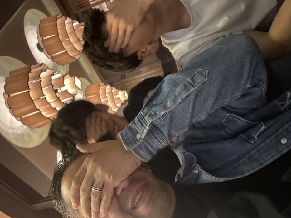Three people cover their eyes with their hands. The person closest to the camera has dark hair and is wearing a black shirt. There is a silver ring visible on their finger. Behind them is another person with dark hair wearing a denim jacket. The furthest person wears a white t-shirt and has dark hair. Three decorative light fixtures are visible on the ceiling.