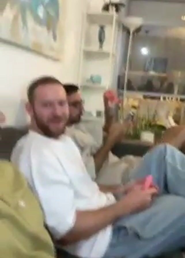 A group of men are sitting in a living room. One man in a white t-shirt and light blue jeans is holding a pink object. Two men are sitting next to him on the couch, one in a green sweatshirt and the other in a light gray t-shirt. Another man is sitting in a green armchair wearing a blue t-shirt and shorts. There are drinks on the coffee table. The room is well-lit and has a large window. The men are talking.