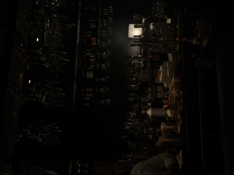 A dimly lit bar interior reveals shelves lined with bottles. The shelves stretch high and appear to hold a variety of spirits and wines. Hanging glass racks contain numerous wine glasses. In the foreground, a small floral arrangement and various objects sit on the counter. A person in a white shirt appears at the bottom, facing away from the viewer.