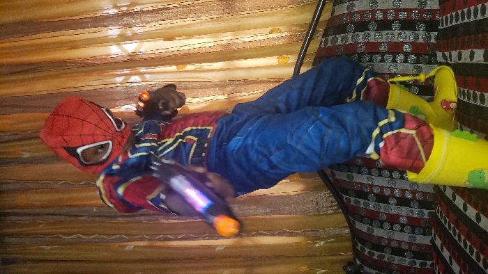 A child dressed in a Spiderman costume poses with two toy guns. The child wears a red and blue Spiderman suit with matching mask. The child is lying on a patterned fabric surface. The background includes wooden planks and a patterned fabric. The child's toys feature orange and blue lights.