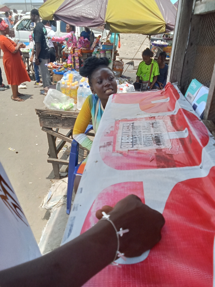A street vendor in Ovwian, Nigeria, is selling products from behind a large red sign. She is seated in a blue chair, facing forward, and holding a white cloth. She is wearing a yellow and black striped top. A man's arm, wearing a bracelet with multiple silver crosses, reaches up toward the sign from the bottom of the frame. The vendor is sitting in front of a wooden table with various plastic bottles on it, covered by a green plastic cover. There is a white canopy above the vendor and table. The location is near a busy street, with other people in the background. There is a red car parked in the distance. The ground is paved with concrete. The vendor appears to be ready to help customers.