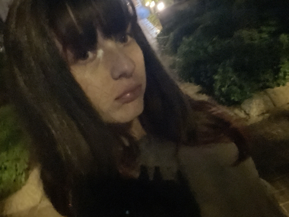 A woman with dark hair and bangs poses close to the camera. Her expression is slightly downcast. The background is dimly lit with dark green bushes and glimpses of outdoor lights. She appears to be standing outside at night. Her clothing is mostly obscured by shadows, but a light-colored jacket or shirt is visible at the edges of the frame.
