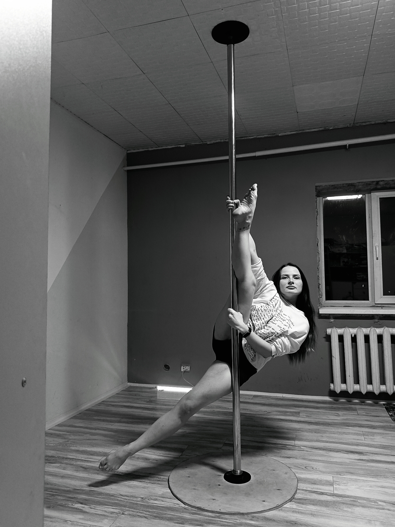 A grayscale image shows a woman performing a pole dance. She is holding a vertical metal pole with her left arm and left leg, extending her right leg upwards. She wears a patterned shirt and dark shorts. The pole is mounted on a circular base and extends to the ceiling. The setting appears to be an indoor room with light-colored wood-look flooring, gray walls, and a ceiling with a textured tile pattern. A window is visible behind the woman, along with a radiator. An unidentified object is located near the floor and the wall on the left side of the image. The location of the image is Rusalevka, Russia. This is an assumption, based only on the user request.