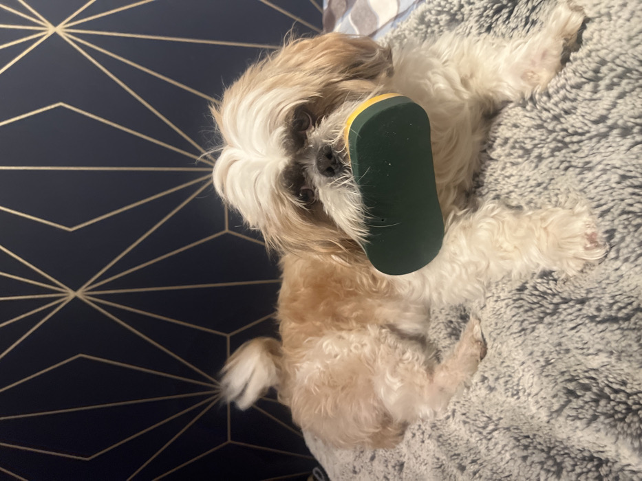 A small, light brown and white Shih Tzu dog lies on its back on a gray blanket. A green and yellow object sits on its chest. The dog is centered, with its head near the top and its tail near the bottom. Its eyes are open and looking at the viewer. Behind the dog is a dark blue wall with gold geometric lines.
