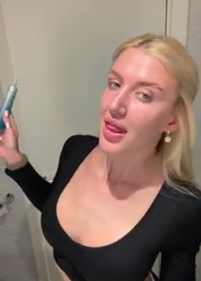woman with blonde hair in a bathroom. She is wearing a black long-sleeved top and has visible eyebrow markings. She holds a blue and white tube in her left hand. She is speaking and dancing to music. She points to her chest, pulls a funny face, and then winks at the camera. A toilet and door are visible in the background.