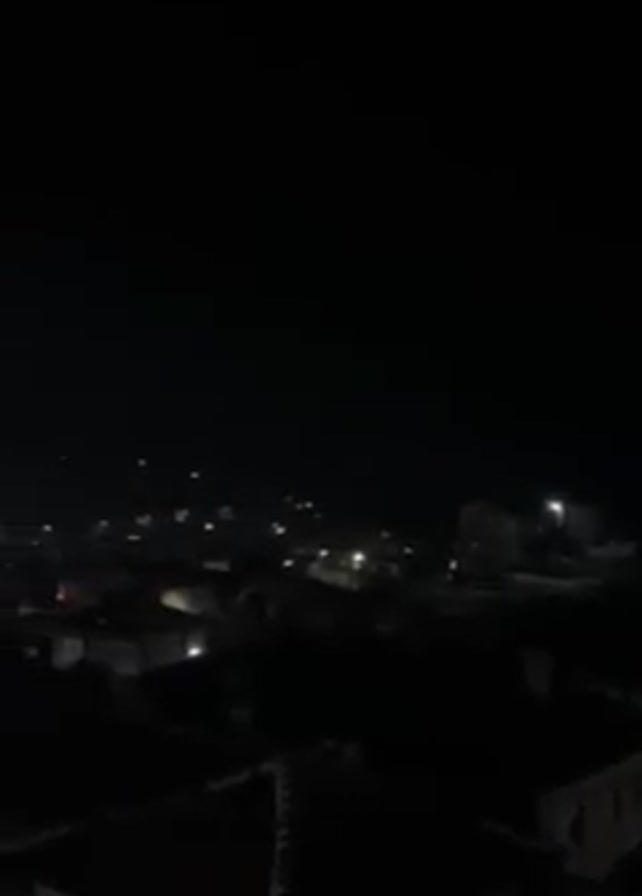The video depicts a nighttime cityscape viewed from an elevated position. The sky is dark, and the city below is illuminated by numerous artificial lights. Buildings and rooftops are discernible, creating an urban landscape. The scene is relatively still, with the focus being on the overall urban sprawl under the cover of night.