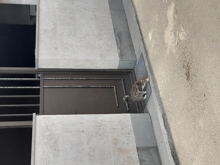 - "In Yerevan, Armenia, a gray and white tabby cat is depicted crouched on a dark gray rectangular doormat positioned directly in front of a residential entrance" by FM-iphKu2, licensed under CC BY 4.0