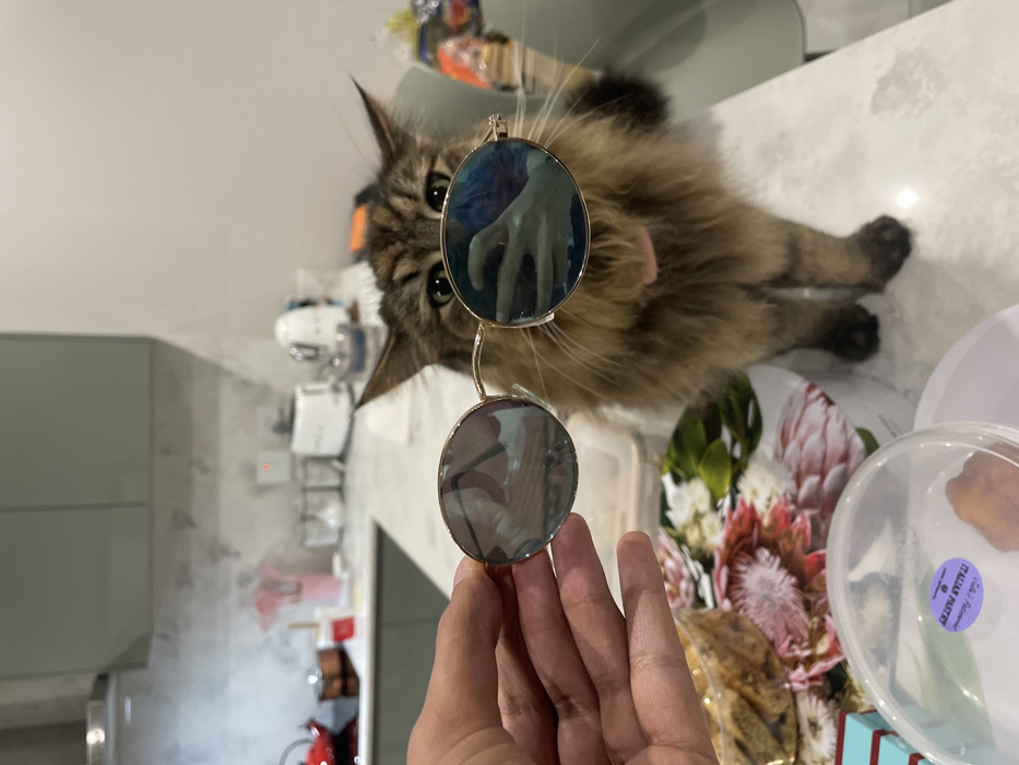The scene depicts a domestic long-haired tabby cat standing on a white kitchen countertop. A light-skinned human hand holds a pair of round, gold-framed sunglasses with reflective blue-tinted lenses in front of the cat's face, obscuring part of its head. The cat's eyes are visible above the lower rim of the sunglasses, directed towards the viewer. A light pink collar is present on the cat's neck. In the foreground, on the countertop, a clear plastic container holds an orange-brown pastry, with a purple label visible, partially stating "ITALIAN PASTRY" and "Durban." Adjacent to this are another clear plastic container containing baked goods and a white cylindrical box adorned with a floral pattern featuring pink, red, and green protea-like flowers. The background reveals a modern kitchen with light green flat-front cabinets, a stainless steel extractor hood, a light-colored tiled backsplash, and various kitchen appliances including a red kettle, a white toaster, and a white electric kettle. The setting is a residential kitchen in the city of Durban, South Africa.
