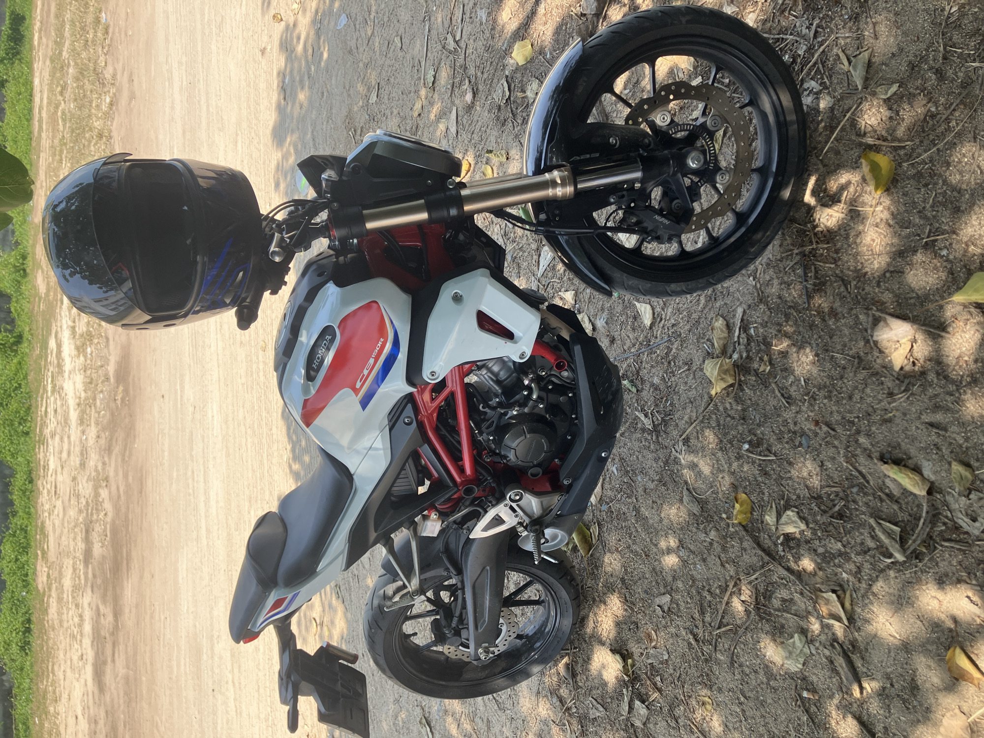 A Honda CB 150R motorcycle is stationary, parked on a dirt and sandy surface in Choeng Mon, Thailand. The motorcycle features a white, red, and blue livery on its tank and side panels, a red trellis frame, and black wheels with disc brakes. A black full-face motorcycle helmet, marked with subtle blue accents, rests on the handlebars/headlight assembly. The ground is sparsely covered with dry leaves and small twigs, exhibiting dappled sunlight and shadows from overhead foliage. The background consists of a lighter-colored, unpaved open area, bordered by dense green vegetation. No individuals are present.