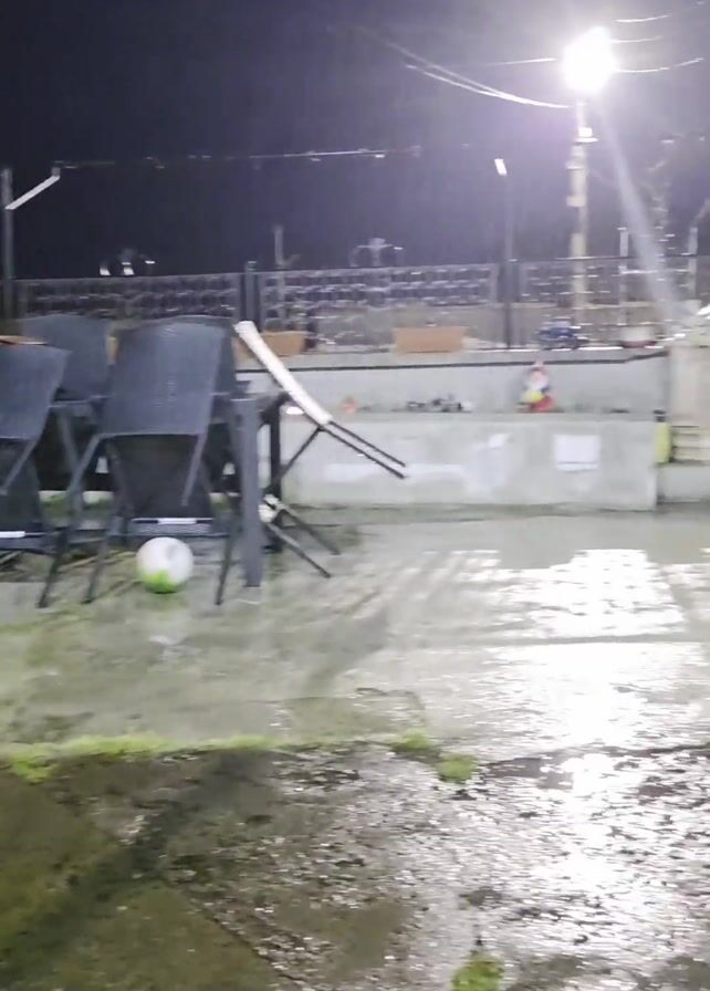 The camera pans across a wet concrete patio or yard at night. The area is illuminated by a single bright street light, casting long shadows. Scattered across the patio are several black plastic chairs, some of which are overturned or askew. A white soccer ball is visible near the chairs. The concrete surface is damp and patchy with green moss. In the background, there is a concrete structure, possibly a planter, with a metal fence along the top. Beyond the fence, there is a building with closed brown corrugated metal doors. A garden hose is coiled and hung on the concrete structure. To the right of the frame, there is a set of concrete stairs with a black metal railing. A leafless vine structure stands near the stairs, its shadow stretching across the patio. The scene appears deserted and slightly disarranged.