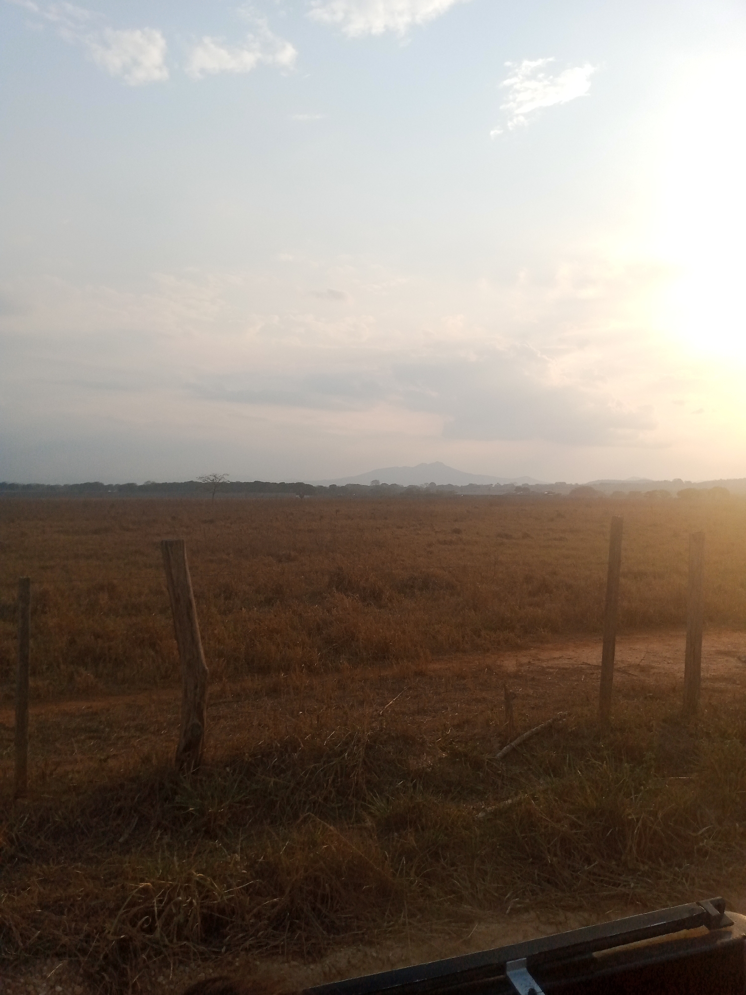The scene depicts a rural landscape in Marta, Venezuela. The foreground features a field of dry, brown grass interspersed with scattered wooden fence posts. A dirt path or road is visible meandering through the field. In the distance, a treeline and a mountain can be discerned under a hazy sky illuminated by the setting sun. The lower portion of the image shows the frame and parts of a vehicle, probably a camera or other equipment.