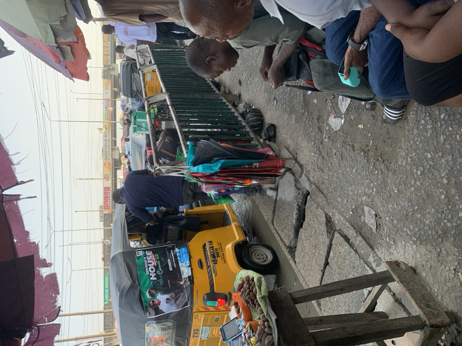 The image captures a bustling roadside scene at the Jubilee Bridge in Ajah, Lagos, Nigeria, under a bright, hazy sky