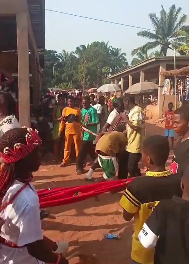 lively scene in what appears to be a village or small town in Africa, possibly during a celebration or festival. Several people are dressed in colorful traditional clothing, including red and black patterned fabrics and white outfits. Some individuals are holding a long red cloth, possibly part of a performance or ritual. Children wearing yellow and black shirts labeled "HELLO" can be seen in the crowd. Buildings line the dirt road or path, some with open fronts and merchandise on display, suggesting a market area. A motorcycle is parked near one of the buildings. The atmosphere seems festive, with people gathered and interacting. There are palm trees and other greenery in the background, indicating a tropical or subtropical environment.